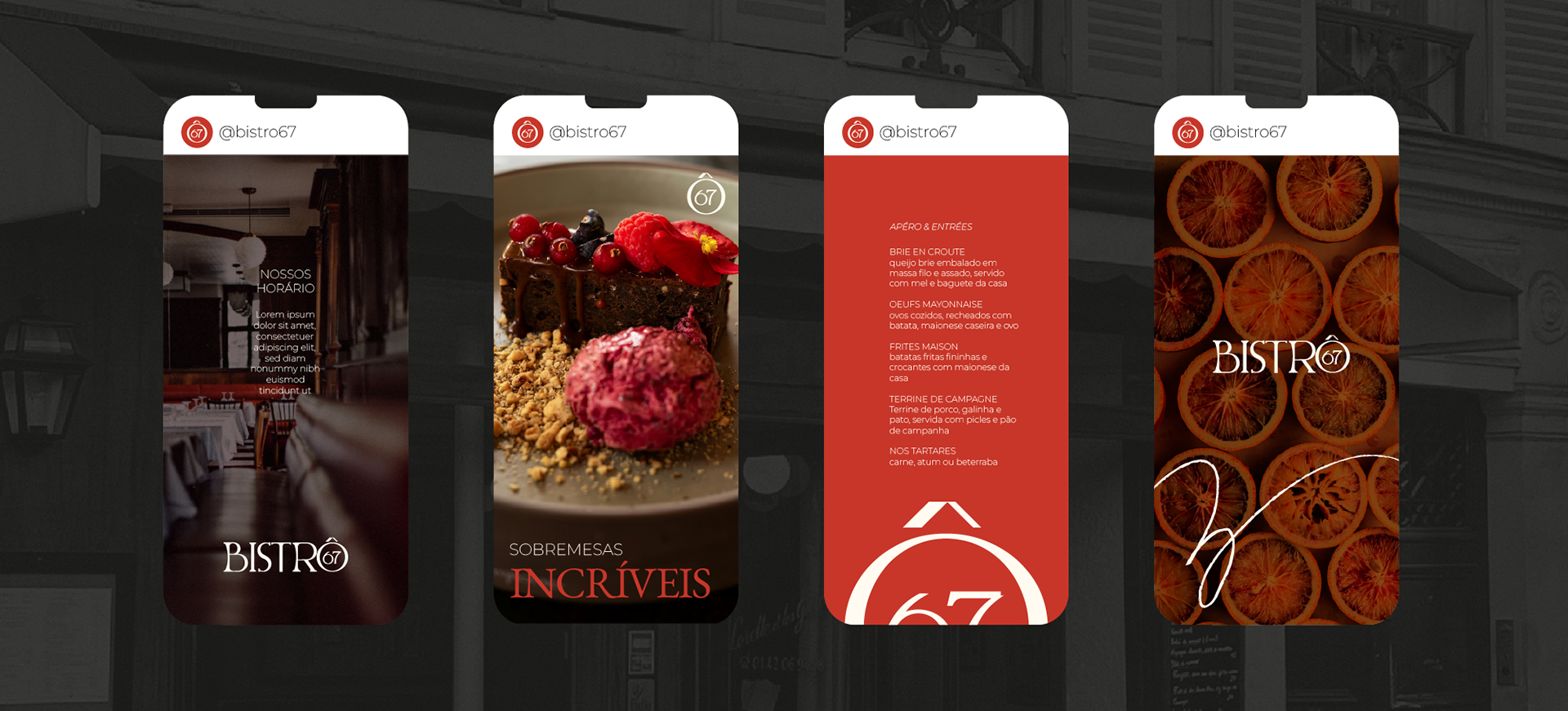 Bistrô 67's proposal is to bring classic French cuisine with a modern look and an environment that transports customers to France. To this end, the logo is based on a more classic typography, which was modified to have sinuous curves, softening the rigidity of the original forms. For the colors, the classic red, found in the French flag, and shades of brown, to maintain elegance and escape the commonly used blue. As support, illustrations with more abstract lines and a more rustic finish are used to express something more manufactured, and therefore consequently, more welcoming.