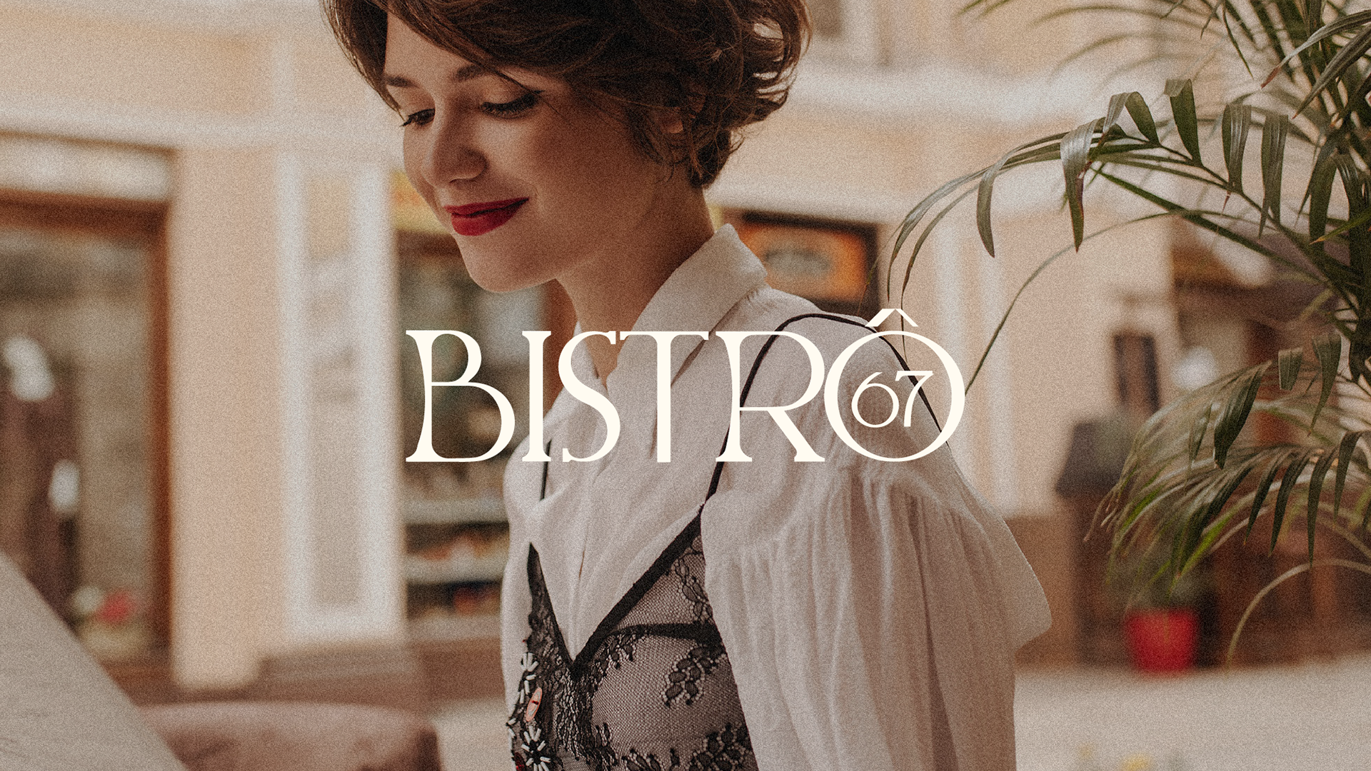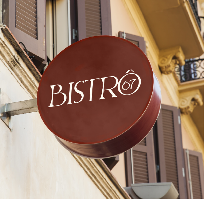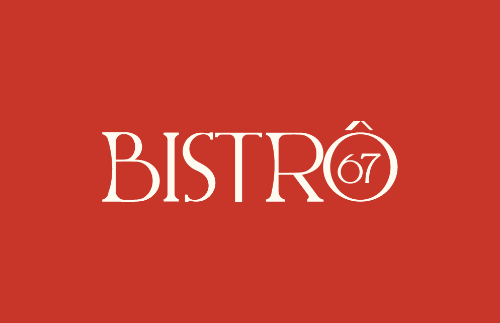 A proposta do Bistrô 67 é trazer a cozinha francesa clássica com um olhar moderno e um ambiente que transporta os clientes para a França. Para tanto, o logo se apoia em uma tipografia mais clássica,que foi modificada para ter curvas sinuosas, suavizando a rigidez das formas originais.